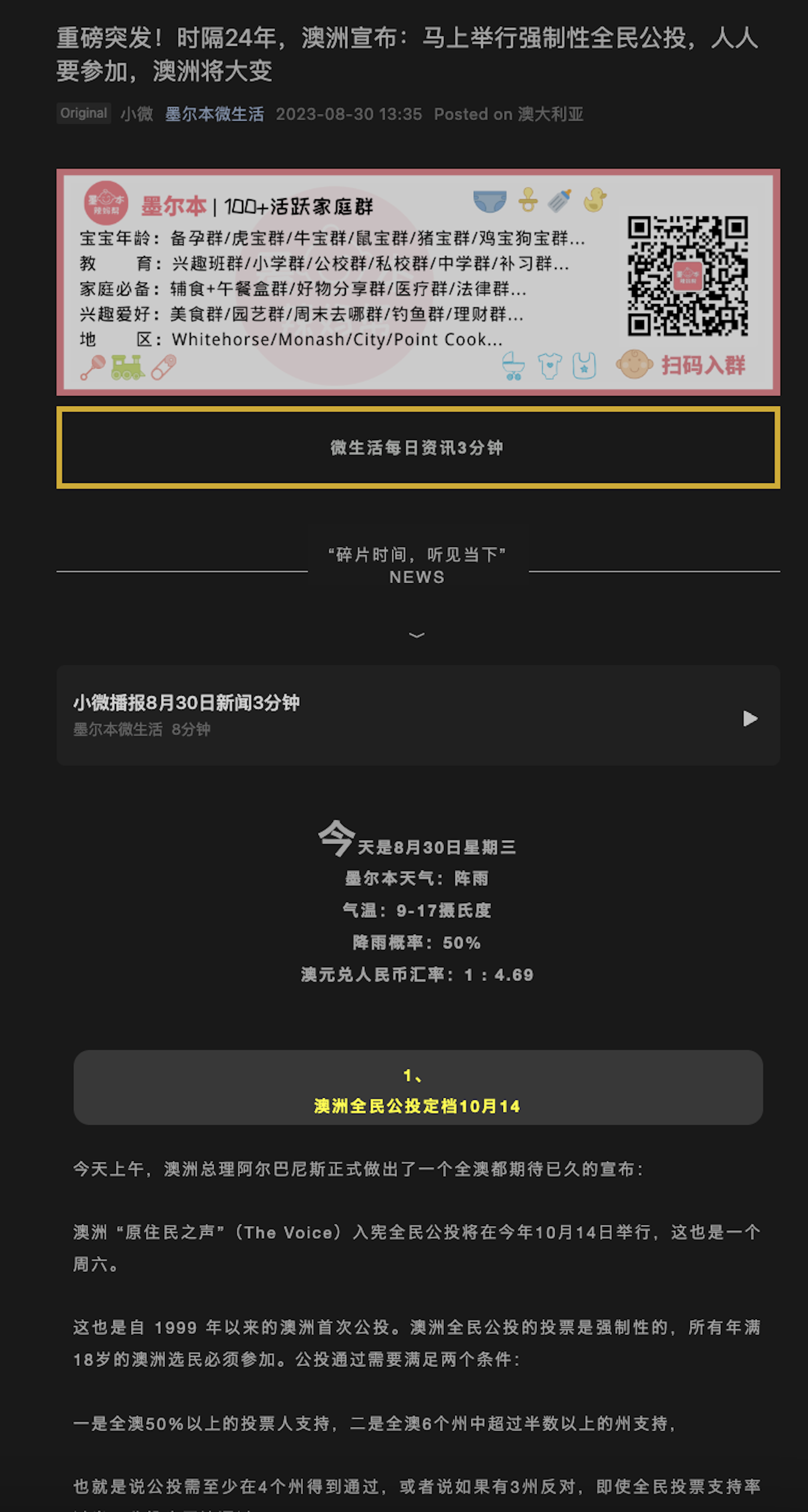 The AEC posted a series of sponsored articles to explain the Voice and the voting procedure (as seen in the post below). The AEC posts were much more formal and official sounding than most public posts on WeChat.
