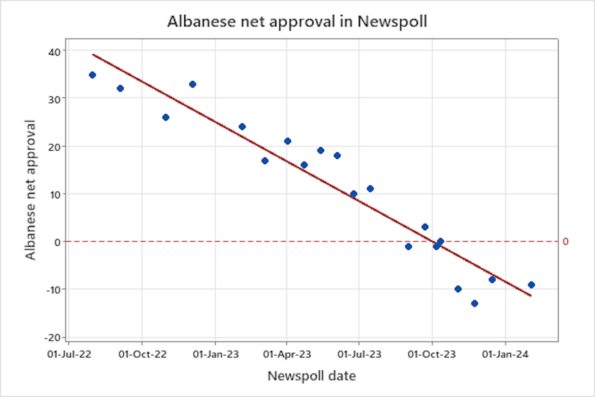 Here is a graph of Albanese’s net approval in Newspoll. His net approval is still well below zero, and hasn’t recovered to its level before the Voice referendum defeat.