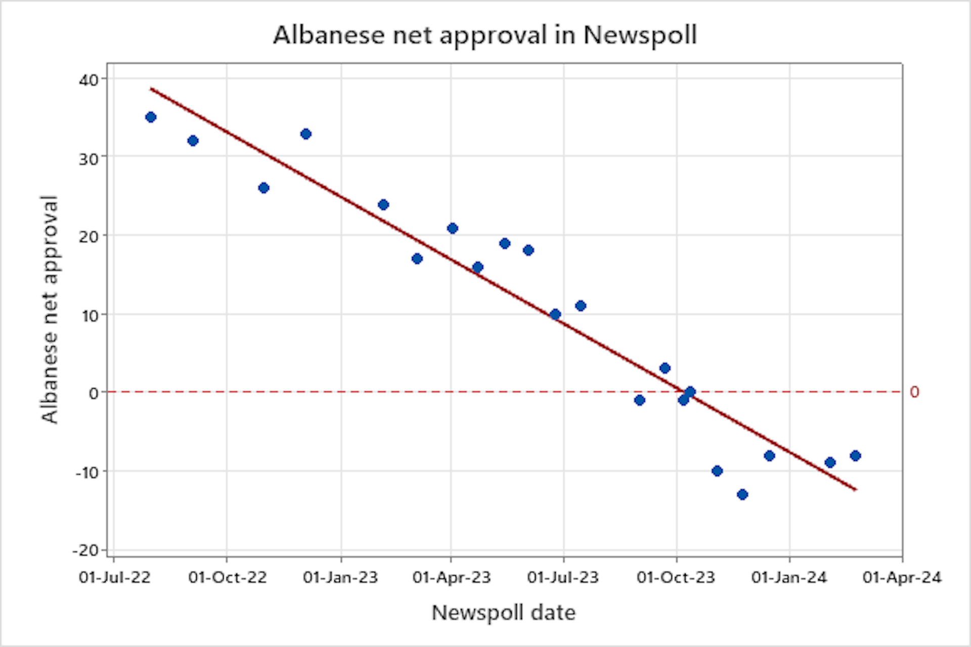 This graph of Albanese’s net approval in Newspoll shows there has not been a recovery since the defeat of the Voice referendum.