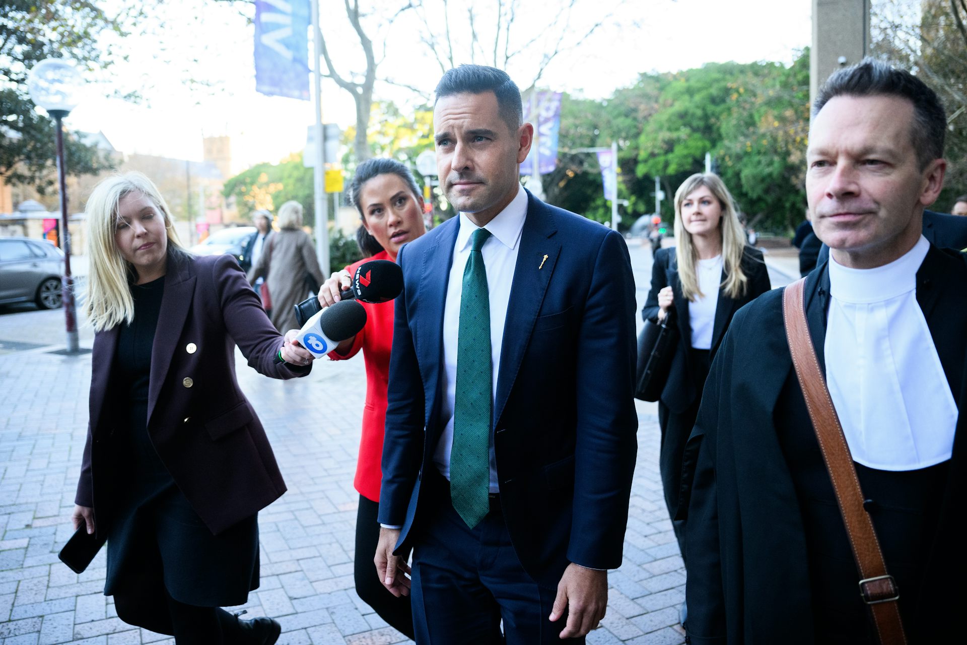 A man in a suit and green tie walking outside, surrounded by his lawyers.