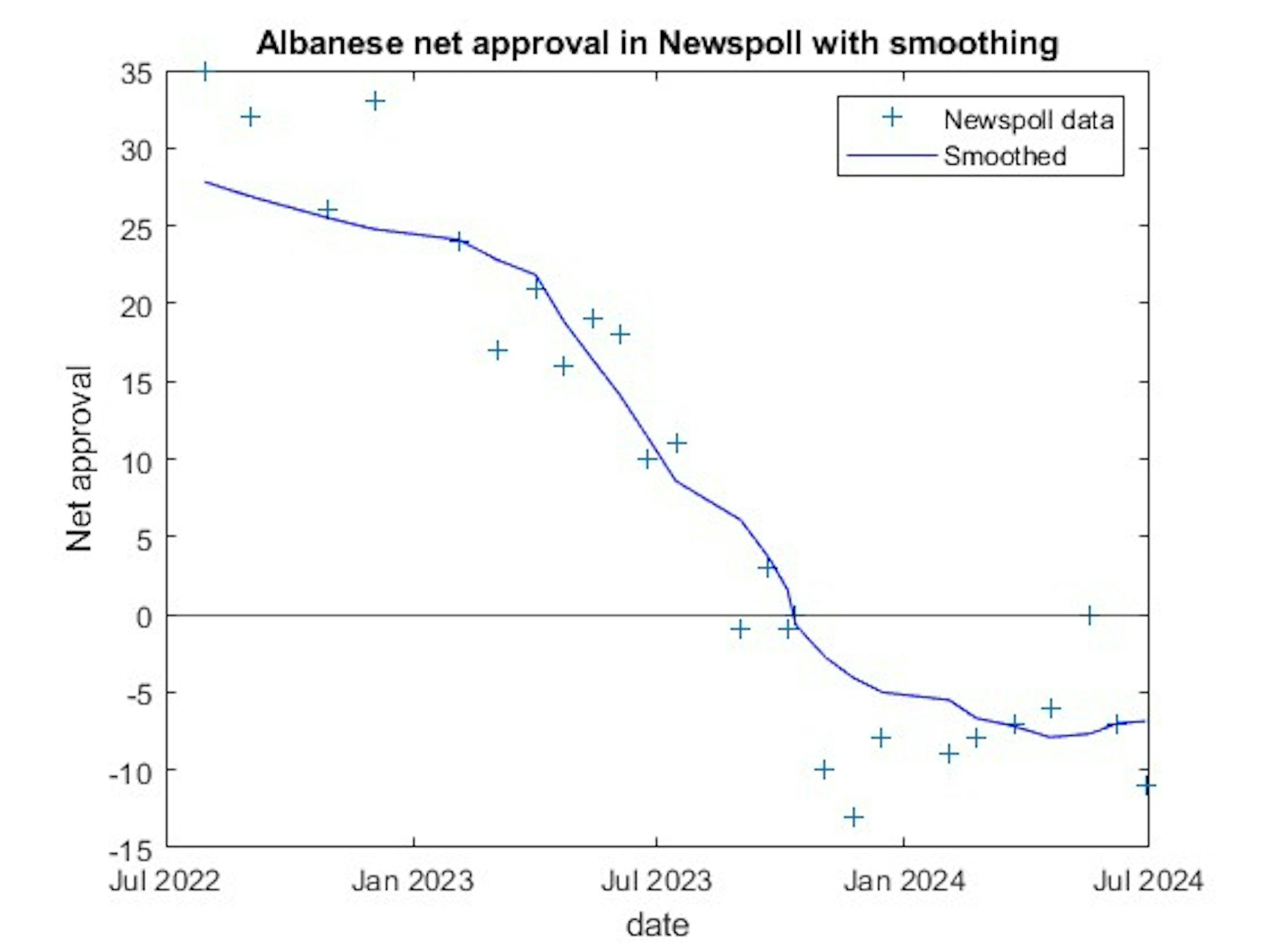 On Prime Minister Anthony Albanese, 53% were dissatisfied (up three) and 42% satisfied (down one), for a net approval of -11, down four points. This is Albanese’s lowest net approval since -13 in November 2023, after the Voice referendum. The graph below has Newspoll data on Albanese’s net approval (plus signs) for this term with a smoothed line fitted.