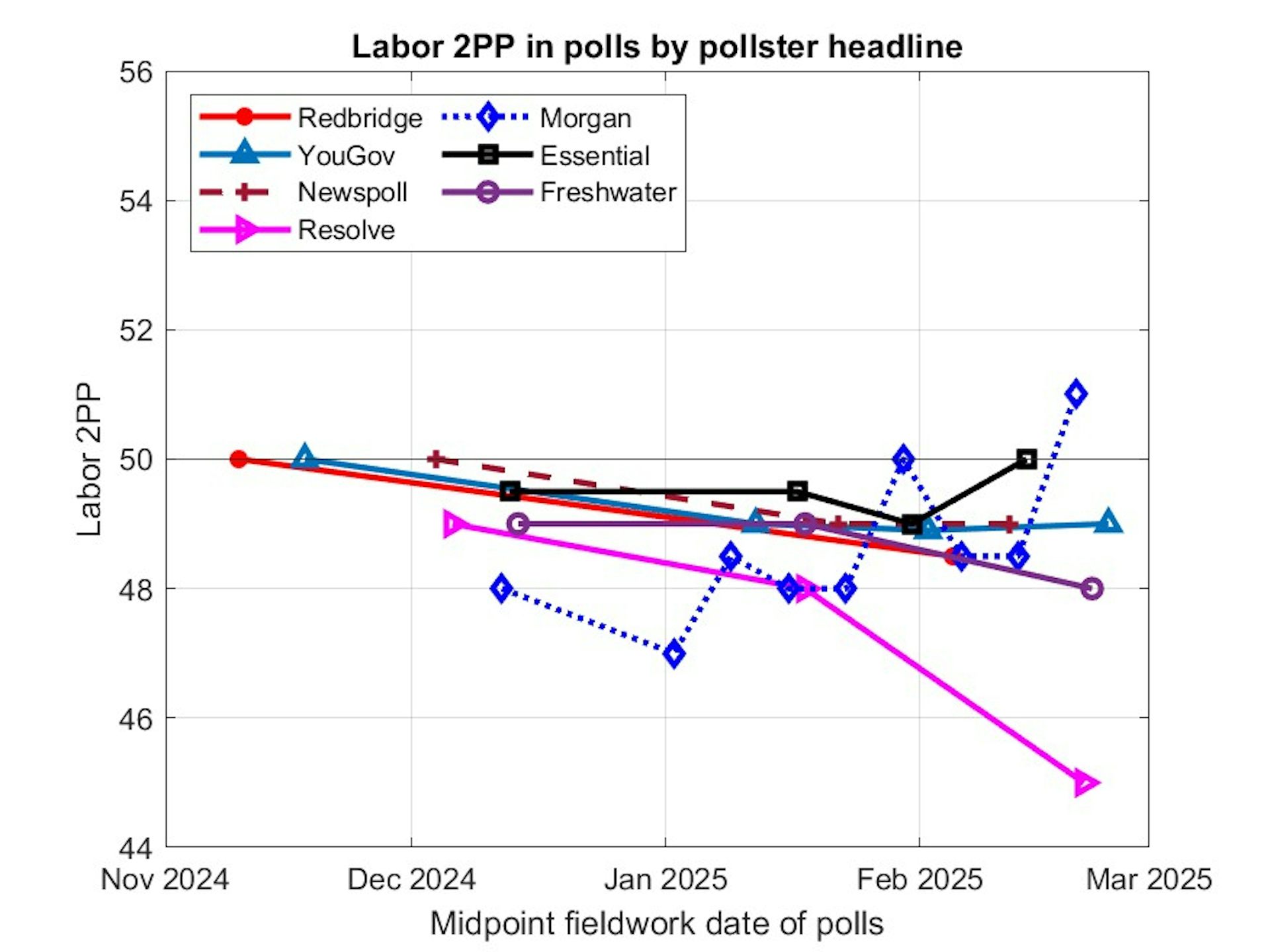 The graph below shows Labor’s two-party estimated vote in national polls, so the Redbridge marginals poll is excluded.