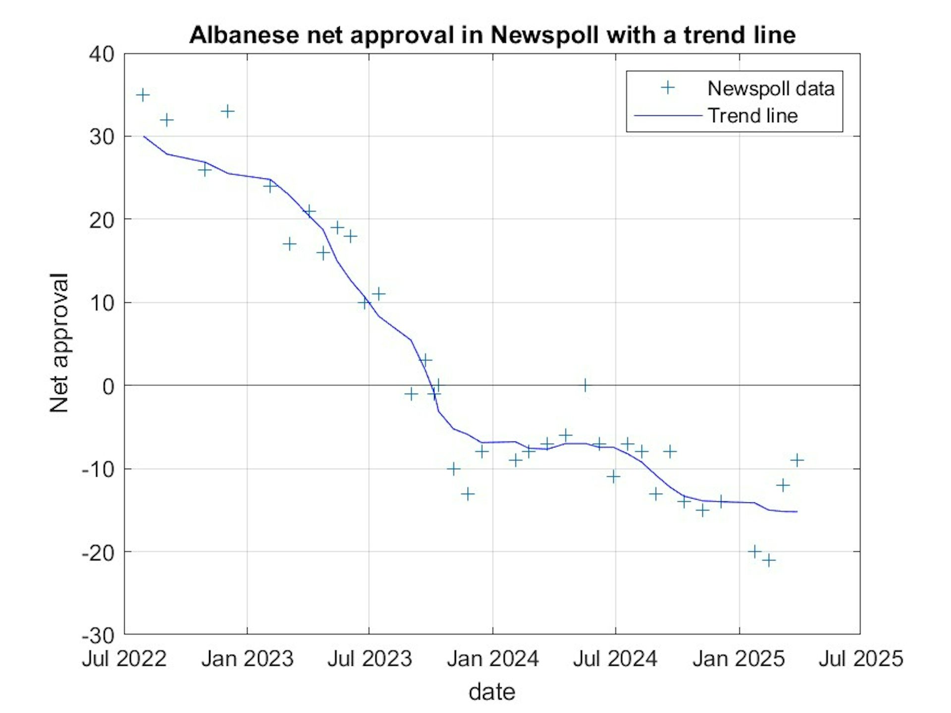 This is Albanese’s best net approval in Newspoll since September 2024, Dutton’s worst since October 2023 and Albanese’s biggest better PM lead since May 2024. Here is the graph of Albanese’s net approval in Newspoll this term with a trend line.