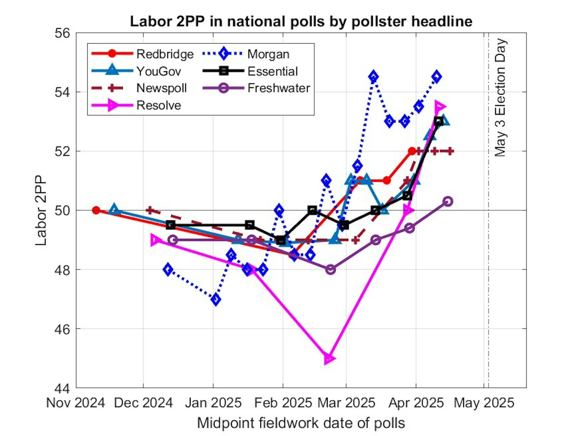 The February Resolve poll was the 55–45 to Coalition outlier, so responses in the prior survey were probably too Coalition-friendly.