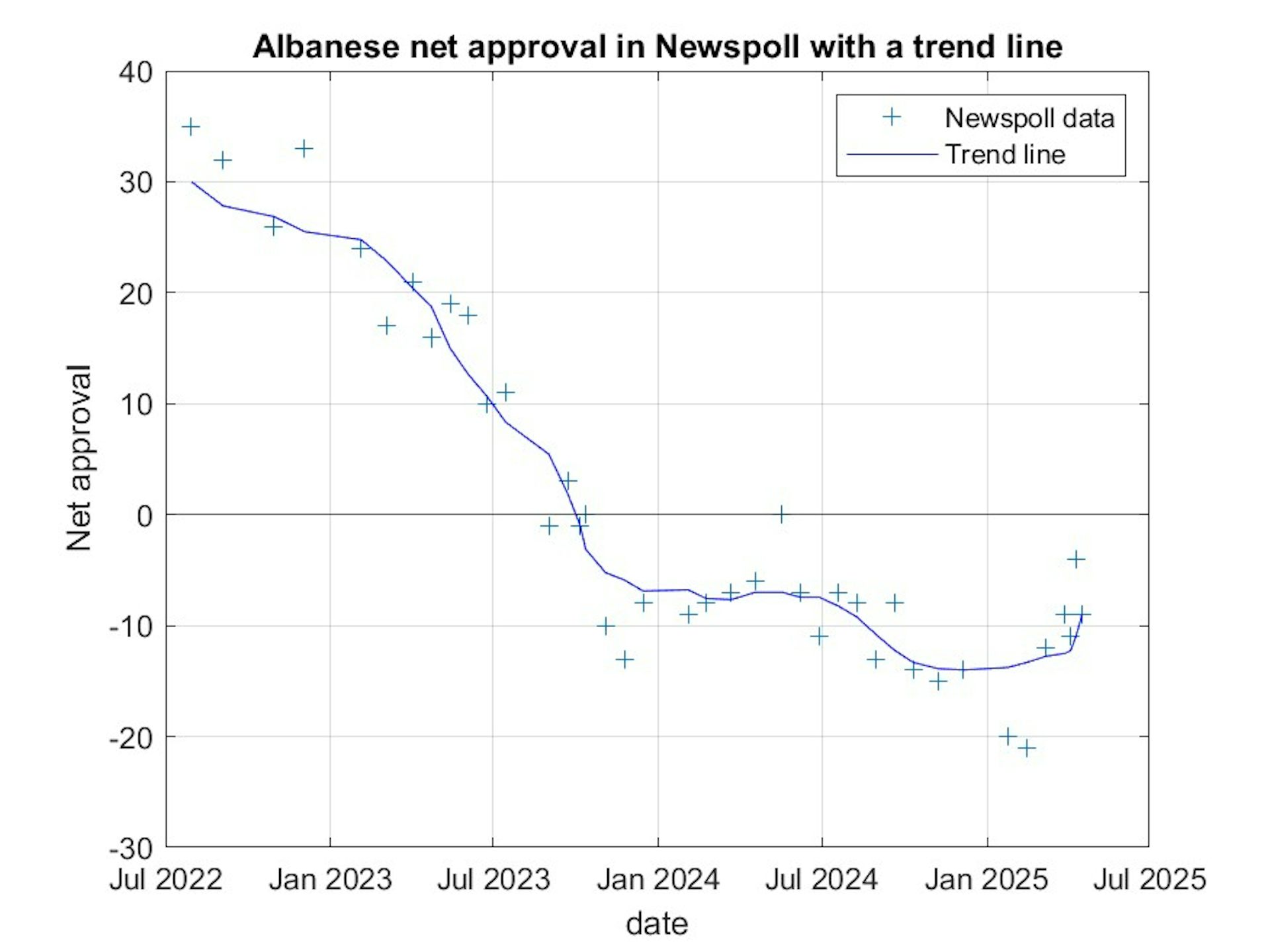 Here’s the graph of Albanese’s net approval in Newspoll this term. The plus signs are data points and a smoothed line has been fitted.