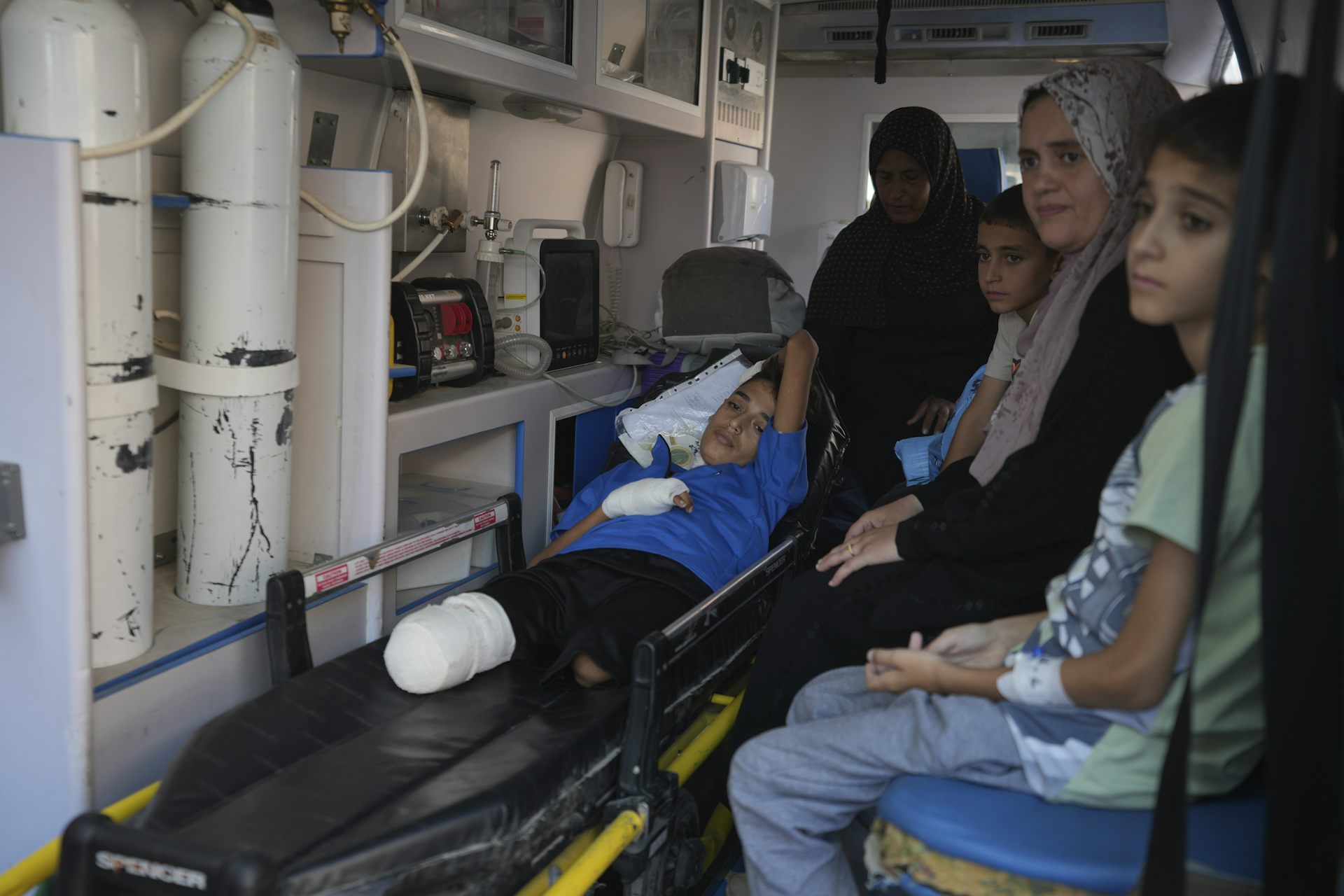 An amputee Palestinian child sits in an ambulance with his relatives as he waits to leave the Gaza Strip for treatment abroad through the Kerem Shalom crossing, in Khan Younis, southern Gaza Strip, Thursday, June 27, 2024