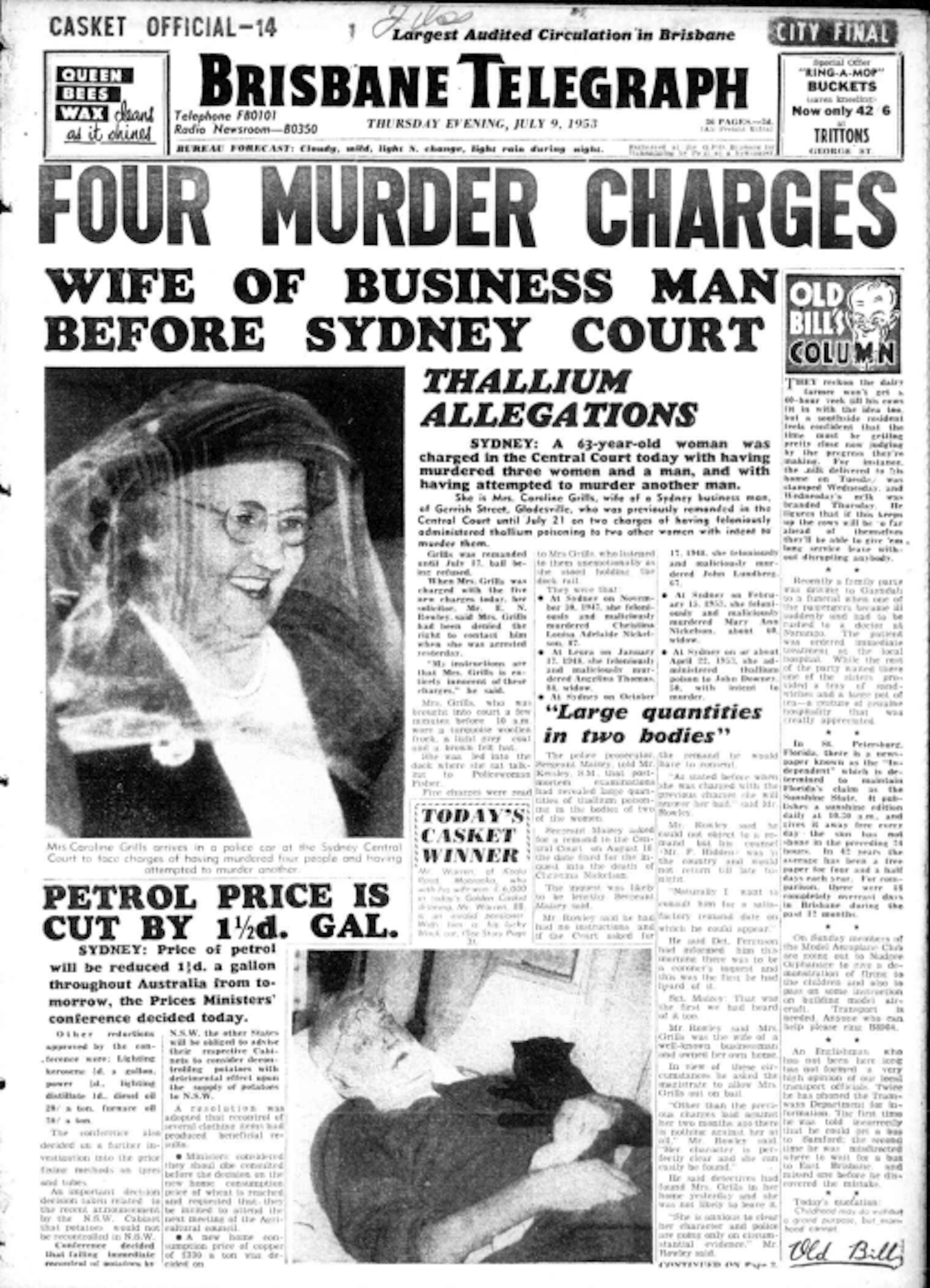 In 1953, Sydney-based Caroline Grills[6] was tried on four counts of murder and one count of attempted murder after police accused her poisoning her in-laws and a friend of her mother using thallium – a key ingredient of rat poison.