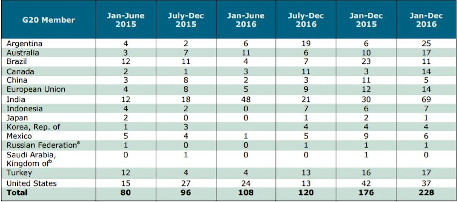 The subjects of anti-dumping actions are usually technical barriers to trade that measurably affect certain industries. In the G20 countries most of these relate to agricultural policies.