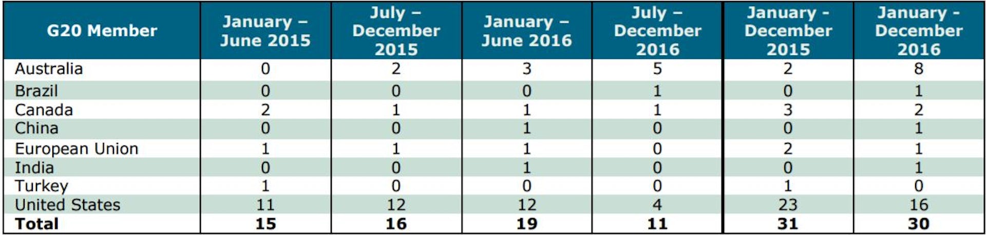 According to a 2017 WTO report on trade measures in the G20 countries[16], new anti-dumping actions have outpaced terminations by three to one. This is the largest gap since 2012. Australia also had a fourfold increase in new countervailing duty measures (trade retaliations, in other words) from 2015 to 2016, second only to the USA. In 2016 Australia started nearly one-third of all G20 trade retaliations.